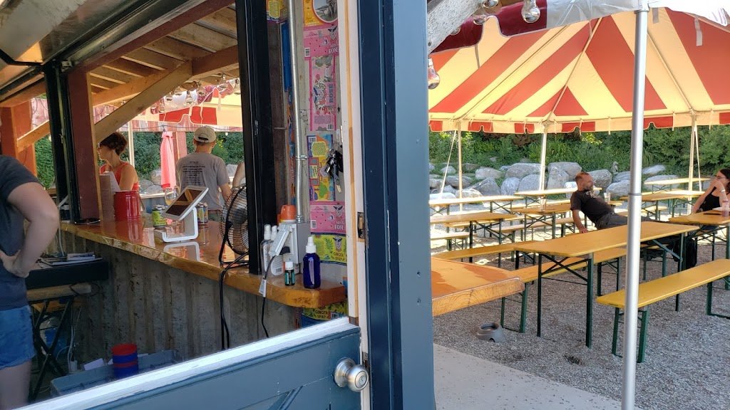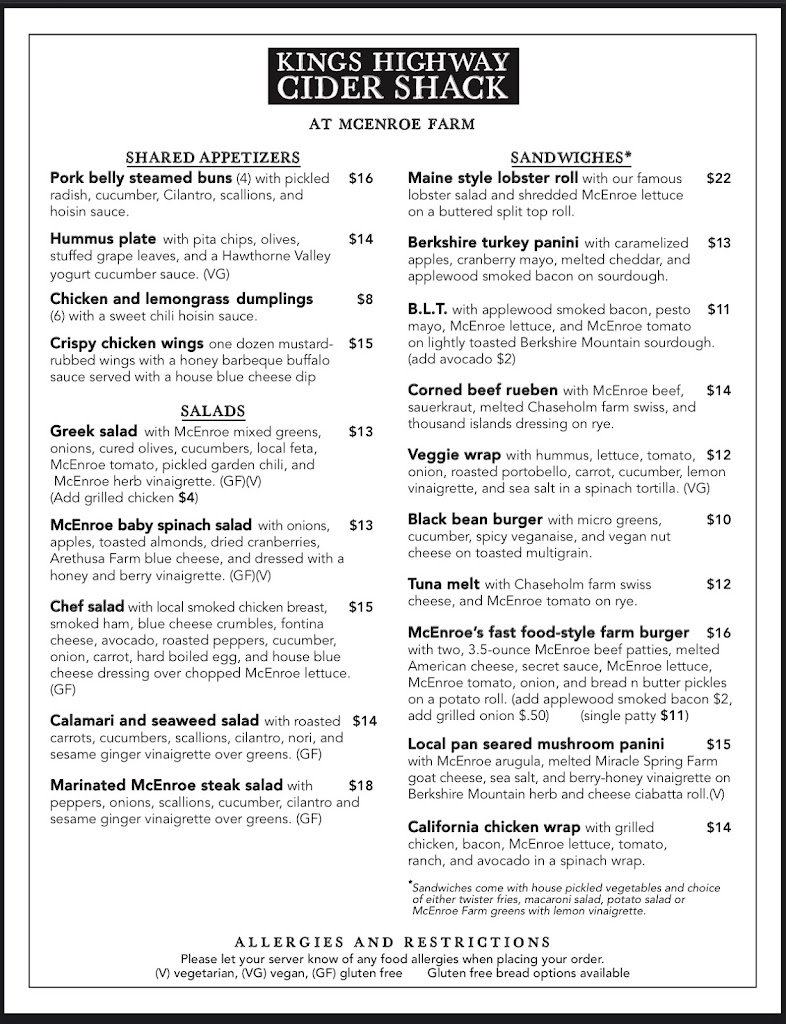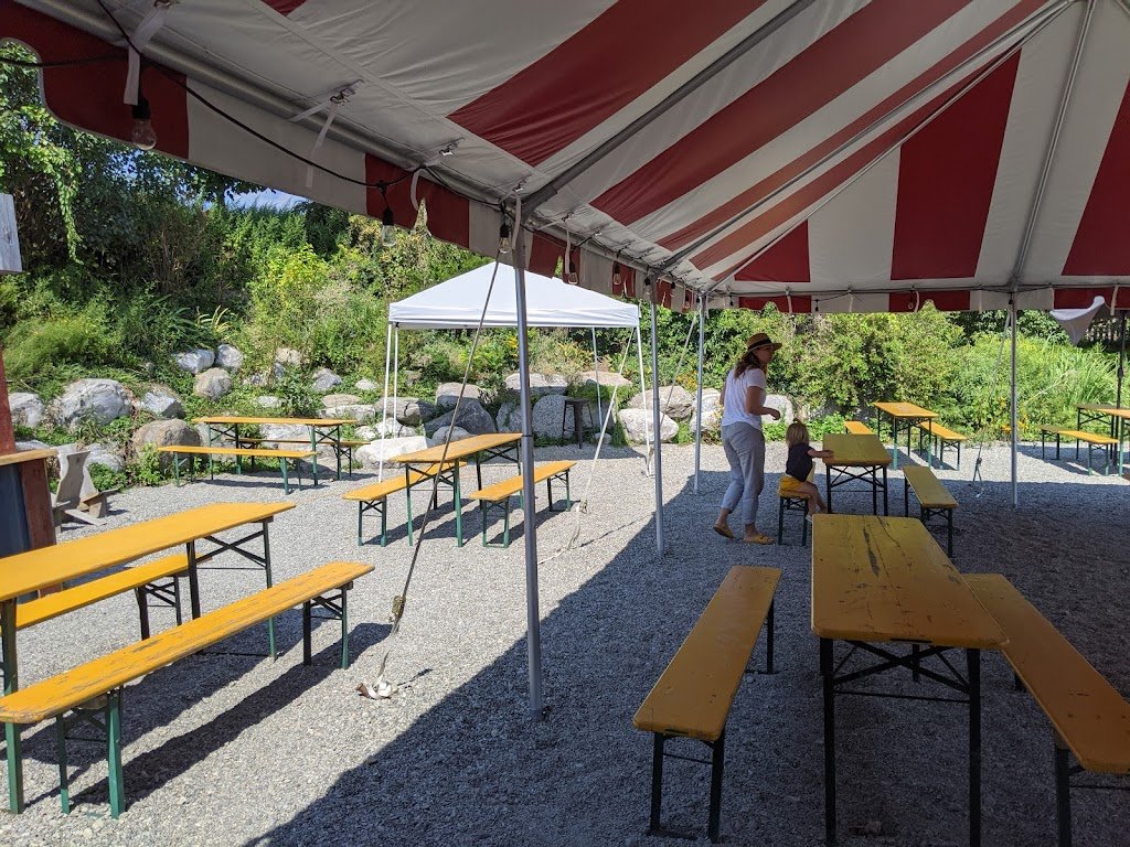 This is our seasonal tasting room for Kings Highway Fine Cider at McEnroe Organic Farm -- the largest organic farm in the Northeast. We have a large selection of craft cider and craft beer, as well as a large food menu including smash burgers (made with beef raised right on our farm), lobster rolls, wings, salads, vegetarian and vegan options, and rotating specials. We have panoramic views of the farm and we're covered with a large tent for sun and rain protection. We're following all of the state regulations. Masks must be worn to order food and when not seated with your party. We also offer to-go sales of both food and craft beverages.