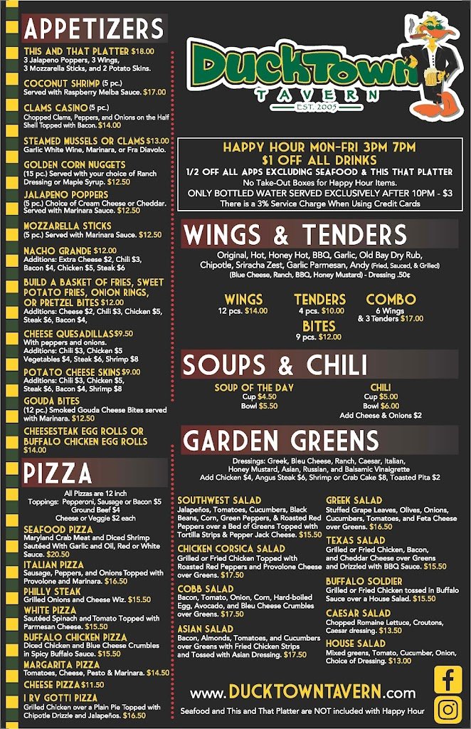 Ducktown Tavern sits at the corner of Georgia and Atlantic Ave in Atlantic City, in the heart of the traditional Ducktown Neighborhood. Located right in the center of town, Ducktown Tavern is two blocks from Tanger Outlets, Bass Pro Shop, Boardwalk Hall and the Beach & Boardwalk of Atlantic City. Ducktown Tavern has a full menu of delicious food and drinks, and features daily Lunch Specials and Dinner Specials, plus Happy Hour, Monday - Friday from 3pm to 7pm.